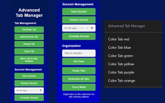 Thêm vào đó, Trình Quản Lý Tab Nâng Cao cho phép người dùng lưu và khôi phục các phiên duyệt web một cách dễ dàng, lên lịch cho các phiên sau này, và nhóm các tab bằng cách đặt hẹn giờ. Tính năng đánh dấu trang chỉ với một cú nhấp chuột nâng cao sự tiện lợi, trong khi Chế Độ Tập Trung giảm thiểu sự phân tâm, khiến nó trở thành giải pháp lý tưởng cho những ai thường xuyên quản lý nhiều tab và phiên làm việc. Công cụ này nhằm tăng cường năng suất và tối ưu hóa quy trình làm việc cho tất cả người dùng.
